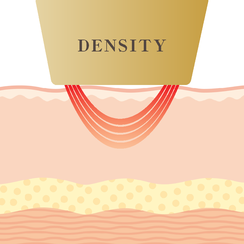 デンシティは、高周波(RF:ラジオ波)エネルギーを使って、たるみの原因となる皮膚の浅層と脂肪層などの深層を同時に引き締める最新のたるみ治療機器です。