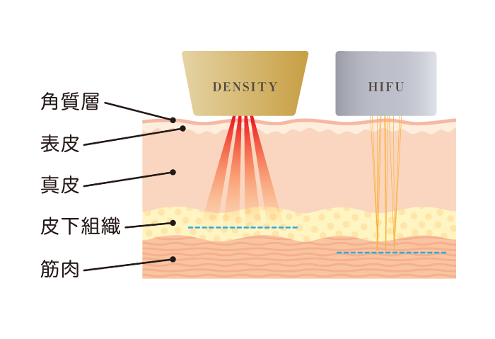 デンシティが得意な浅層〜脂肪層、HIFUが得意なSMAS(筋膜)層。両方を組み合わせることで、立体的なリフトアップ&持続力UPが狙えます。 HIFU詳細はこちら